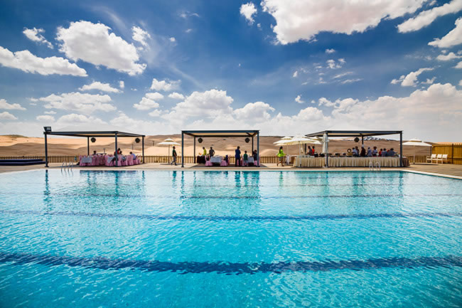 在沙漠中各種深淺的大型泳池里,以各種泳姿釋放自己——在沙丘起伏無際的沙漠里——在沙漠中屬于自己的水的世界里……累了,就躺在清爽的沙灘床上,美美地過上幾個小時,同時可以與同行的人邊吃邊喝邊聊哦,別睡著了,演出一定會有的,悅沙島每天會有十多場不同的演出或比賽,是藝術的、是體育的……