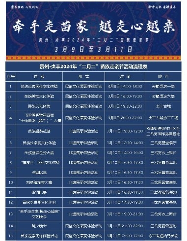 2024年3月9日至11日,貴州貞豐將迎來盛大的“二月二”苗族走親節(jié)活動(dòng)。本次活動(dòng)由貞豐縣苗學(xué)會(huì)主辦,貞豐縣雙峰文旅集團(tuán)協(xié)辦。