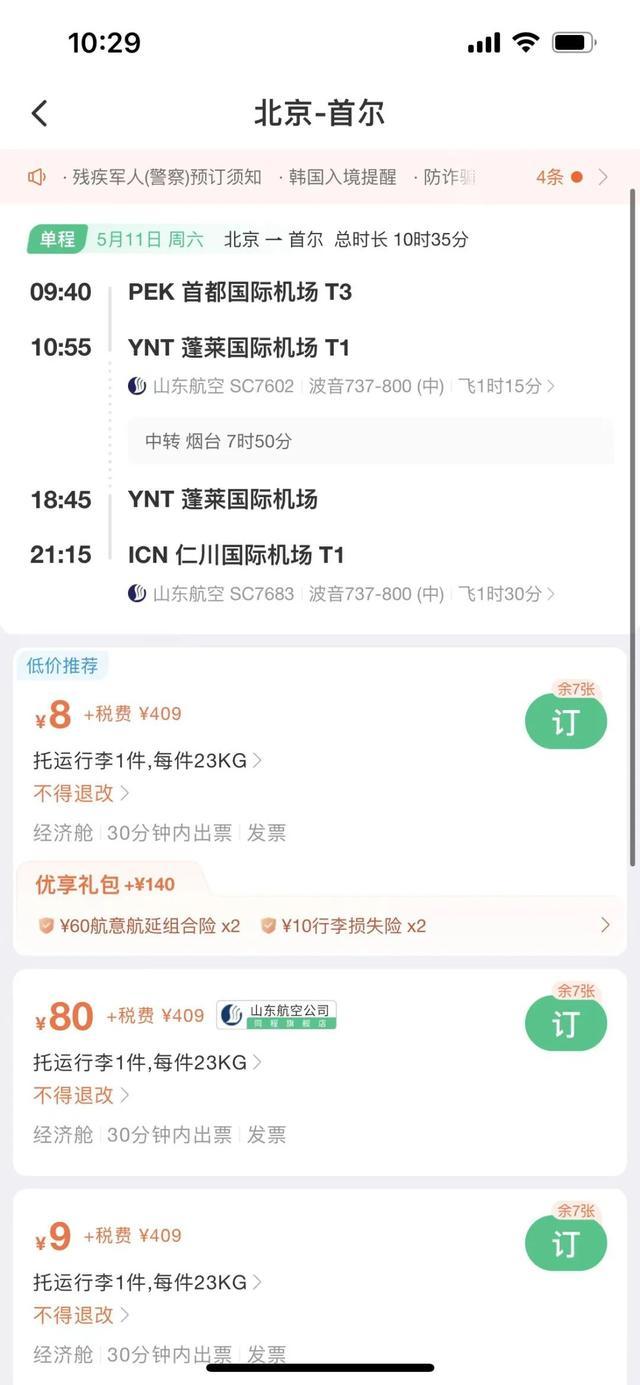 國際機(jī)票方面,中新經(jīng)緯查詢發(fā)現(xiàn),5月11日北京飛往首爾的機(jī)票(不含稅)價(jià)格低至8元,但另需409元稅費(fèi)。具體來看,該航班5月11日早9點(diǎn)40分從北京首都機(jī)場起飛,經(jīng)煙臺(tái)蓬萊國際機(jī)場轉(zhuǎn)機(jī),于當(dāng)天晚上9點(diǎn)15分落地仁川國際機(jī)場。