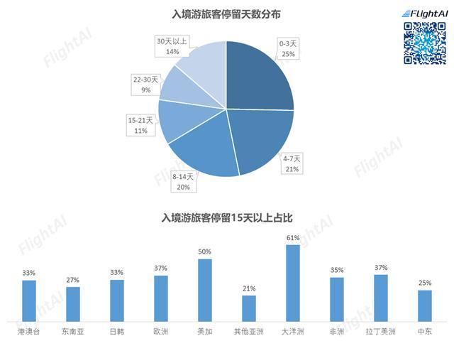 值得一提的是,美國旅客的入境停留時間也更久:今年整體入境游旅客中,近一半旅客停留天數(shù)在7天內(nèi),34%的旅客停留天數(shù)在15天以上,其中,美加、大洋洲旅客停留天數(shù)更久,超一半旅客停留15天以上。