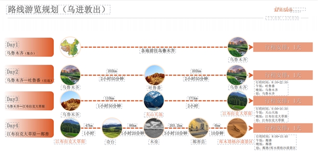 線路三“千里西域行”則以“千年敦煌·萬年胡楊”——烏魯木齊至敦煌絲路星辰探索之旅為主題,該線路亮點(diǎn)為敦煌莫高窟、鳴沙山、伊吾胡楊、北疆自然風(fēng)景觀光和民族文化體驗(yàn)等。全程路線大約2202.6公里
