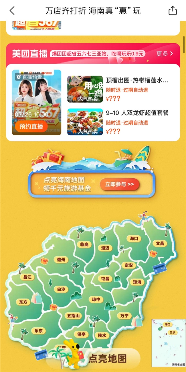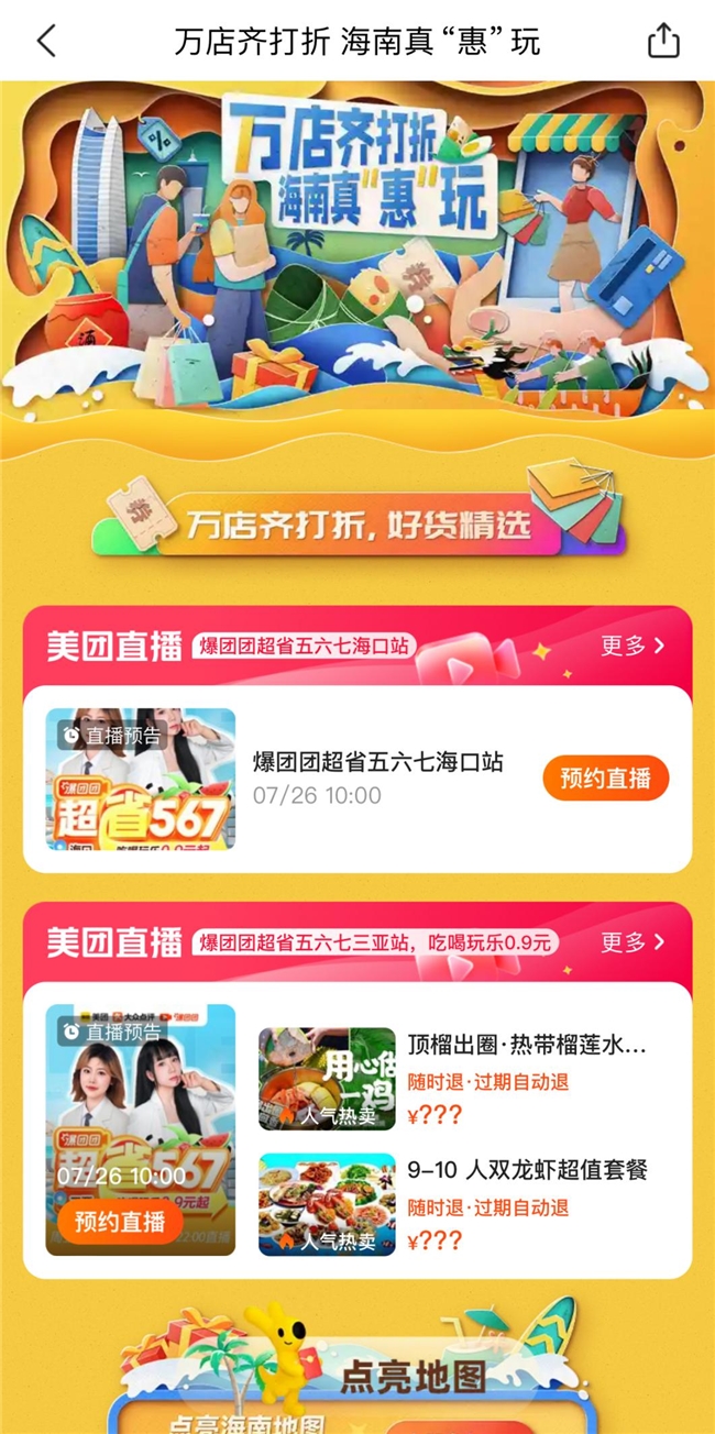 “萬店齊打折 海南真惠玩”主題營銷活動由海南省旅游和文化廣電體育廳和美團(tuán)聯(lián)合發(fā)起,活動覆蓋了海南省內(nèi)十八個城市,全品類商家紛紛參與,為游客們帶來了前所未有的優(yōu)惠和福利;顒悠陂g海南省旅文廳聯(lián)合美團(tuán)攜手一萬家商戶,為廣大消費者和游客提供了不低于1000萬遠(yuǎn)的補(bǔ)貼折扣,用戶只要在美團(tuán)App、大眾點評App搜索“萬店齊打折”等字樣,即可進(jìn)入專題頁,參與各類福利活動。