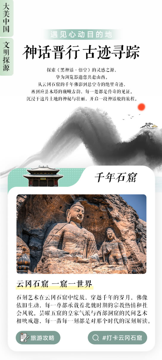 華為瀏覽器的“遇見心動目的地”專題還將于9月29日上線大美中國、文明探源、神話晉行專題,包括大同懸空寺、朔州崇福寺、應(yīng)縣木塔、臨汾鐵佛寺等《黑神話:悟空》游戲中的取景地都會有相應(yīng)的旅游攻略。專題還會根據(jù)旅游的目的地和路線的不同,提供多種不同的行程方案,可以根據(jù)自身的實際情況進行挑選,讓我們的旅程變得無比充實!
