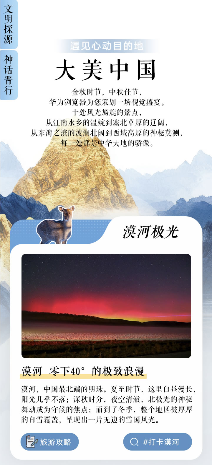 “大美中國”可以說給熱愛自然風(fēng)光的愛好者帶來了視覺盛宴。里面精選了十處極具代表性的中華美景,從溫婉細膩的江南水鄉(xiāng)到遼闊壯麗的塞北草原,從波瀾壯闊的東海之濱到神秘莫測的西域高原,每一處都是對中華大地絕美風(fēng)光的極致詮釋。其中,以漠河“零下40°的極致浪漫”為例,無論是夏日的長晝、深秋的北極光,還是冬日的雪國風(fēng)光,都讓人心生向往。用戶不僅可以在專題頁中詳細了解每一處景點的獨特魅力,還能一鍵直達詳細旅游攻略,包括大興安嶺自駕環(huán)線等周邊推薦,輕松規(guī)劃出完美的國慶出游計劃。
