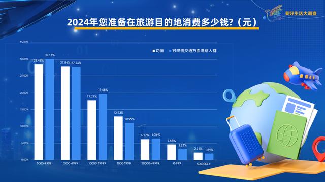 《美好生活大調(diào)查》發(fā)現(xiàn),對交通方面滿意人群,預(yù)計(jì)旅游消費(fèi)在5000至9999元和10000至19999元的占比都高出均值2個(gè)百分點(diǎn)。