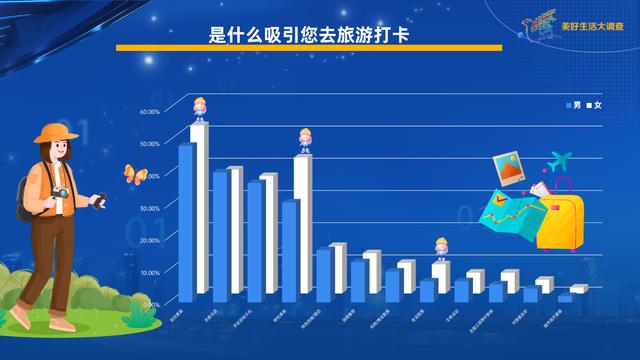 《美好生活大調(diào)查》發(fā)現(xiàn),自然景觀是吸引大家去旅游打卡的最主要因素,有將近一半的人會因此選擇旅游目的地。名勝古跡、歷史民俗文化和特色美食緊隨其后。不同人群中,女性對城市的特色美食超級偏愛,因?yàn)樘厣朗橙ヒ粋(gè)城市旅游的女性占比高出男性11個(gè)百分點(diǎn)以上。跟女性相比,男性對名勝古跡和特色民宿/酒店更感興趣一點(diǎn)。
