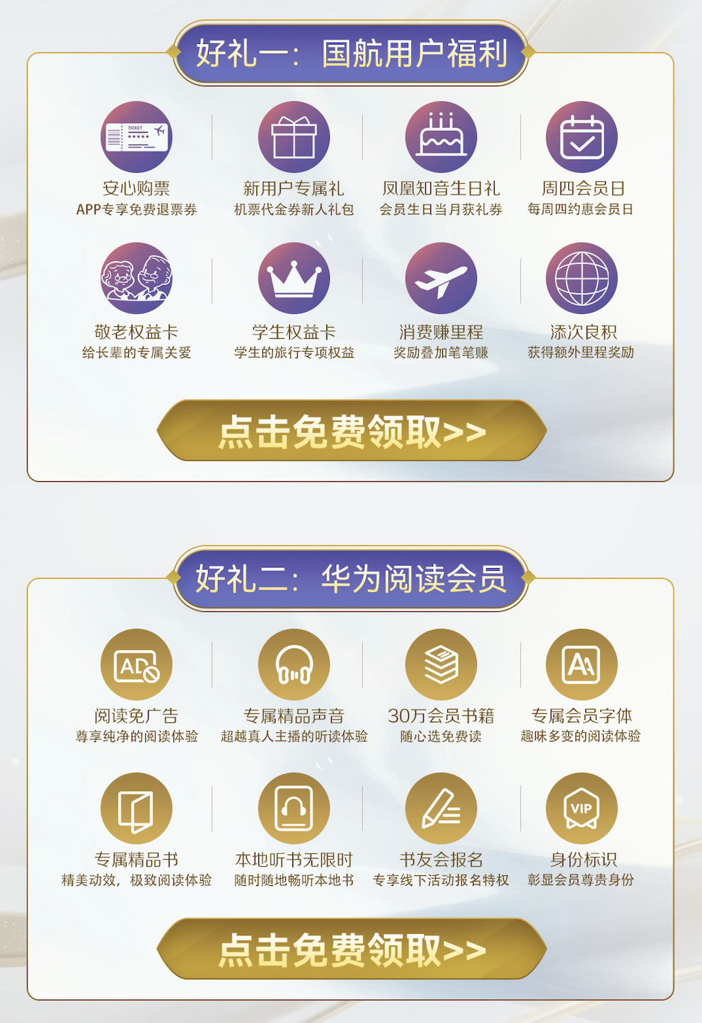 本次活動中,國航為用戶提供了退票券、生日禮、敬老權(quán)益卡、學生權(quán)益、新人專屬禮券等一系列大禮包。華為閱讀則為國航的用戶提供了30天閱讀會員的專屬福利!領(lǐng)取后可以享受超百家知名出版社30萬冊版權(quán)會員書籍免費讀,不僅可以免費使用專屬會員字體閱讀,還能獲得免廣告的純凈體驗。同時,喜愛聽書的用戶還可以使用專屬的精品聲音聽書,本地聽書無限時,加入書架的書籍還內(nèi)置了專屬精品聲音,給用戶帶來超越真人主播的聽讀體驗。華為閱讀還會定期組織線下書友會,領(lǐng)取會員后可專享書友會優(yōu)先報名特權(quán)!