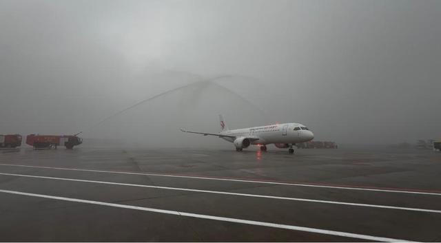 國產(chǎn)大飛機C919在重慶江北國際機場通過水門。新華社記者 趙佳樂 攝