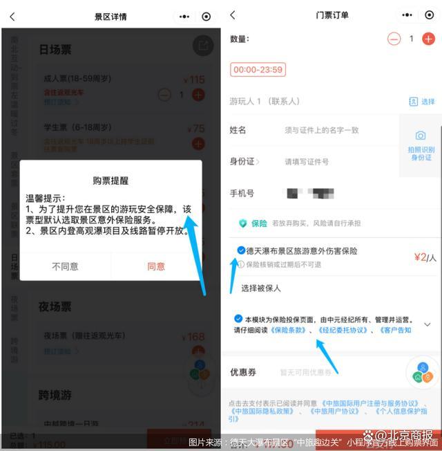 廣西德天大瀑布景區(qū)的官方線上購票渠道在選擇“日場票”(成人票)后,會提示“為了提升您在景區(qū)的游玩安全保障,該票型默認選取景區(qū)意外保險服務”。進一步來看,該景區(qū)默認勾選的保險為“德天瀑布景區(qū)旅游意外傷害保險”,并在保險名稱下方標有“本模塊為保險投保界面,由中元經(jīng)紀所有、管理并運營”。