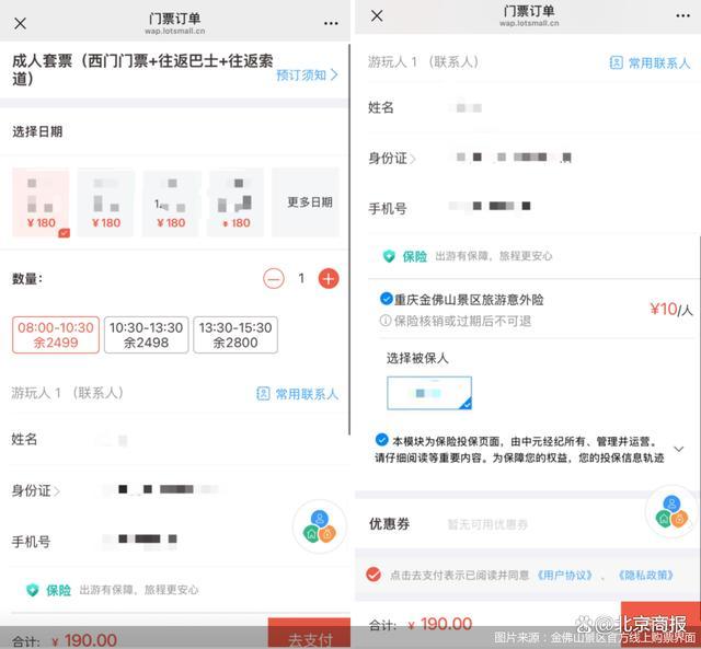 此外,出現(xiàn)“由中元經(jīng)紀所有、管理并運營”相關描述的還有重慶金佛山景區(qū)。在金佛山景區(qū)微信公眾號官方購票渠道中,點擊成人套票(西門門票+往返巴士+往返索道)這一選項后,顯示價格為180元。在提交訂單時,會默認勾選有“重慶金佛山景區(qū)旅游意外險”,價格為10元。該選項旁標有:“本模塊為保險投保頁面,由中元經(jīng)紀所有、管理并運營請仔細閱讀等重要內容。”