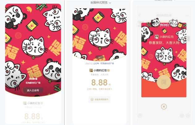 當下微信發(fā)紅包搶紅包已成特有的新春社交儀式,據(jù)微信官方數(shù)據(jù)顯示,2024年除夕夜微信用戶共搶到微信紅包50.8億個,發(fā)送拜年紅包1.9 億次,各大品牌也紛紛推出微信紅包封面,為用戶的拜年社交增添喜氣。蛇年新春,MOKO與插畫家 Cheeky Cheeky 厚面子合作,延續(xù)萌爆漫畫風,由厚面子 Cosplay 新年吉祥物招財貓和頂流大熊貓,在紅包封面上盡顯魅力。新年前分階段陸續(xù)發(fā)放1.5萬個微信紅包封面,為今年的拜年增添滿滿萌趣,拆開紅包的親友,不僅能解鎖MOKO超值新春旅客專屬福利,還能再次回味此前深受用戶喜愛的國風熊貓視頻。