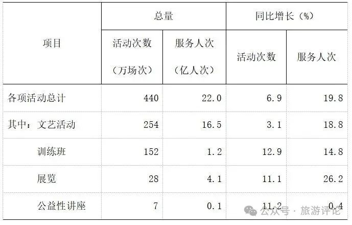 全年全國(guó)群眾文化機(jī)構(gòu)共組織開(kāi)展各類文化活動(dòng)440萬(wàn)場(chǎng),同比增長(zhǎng)6.9%;服務(wù)22億人次,同比增長(zhǎng)19.8%!