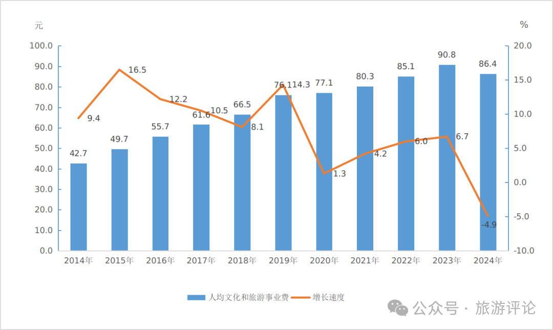 2014—2024年人均文化和旅游事業(yè)費(fèi)及增速情況