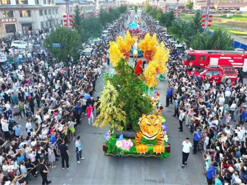 巡游隊(duì)伍中,47名專業(yè)演員的表演同樣精彩紛呈。“金翎飛霄”方陣的男演員們身著女真武士鎧甲,手持長(zhǎng)矛跳起剛勁有力的戰(zhàn)舞;“鐘林毓秀”方陣的女演員則化身森林精靈,輕盈的舞步配合著花車上搖曳的藍(lán)莓枝椏,演繹出林間仙境的唯美畫(huà)面。演員們還不時(shí)走下花車與觀眾互動(dòng),教小朋友模仿鄂倫春族的傳統(tǒng)舞蹈動(dòng)作,現(xiàn)場(chǎng)笑聲不斷。