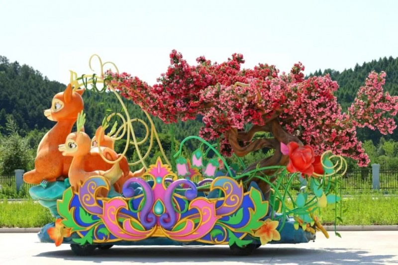 “鹿逐花夢(mèng)花車”,巧妙融合了小興安嶺獨(dú)特的自然景觀與生物多樣性。車頭三只靈動(dòng)的小鹿象征著伊春“中國(guó)鹿鄉(xiāng)”的美譽(yù),與九峰山、金山鹿苑等標(biāo)志性景觀交相輝映。盛開(kāi)的杜鵑、百合和冰凌花點(diǎn)綴其間,展現(xiàn)伊春四季分明的生態(tài)特色;ㄜ囃ㄟ^(guò)森林古樹(shù)與野生動(dòng)物的和諧共生場(chǎng)景,生動(dòng)詮釋了伊春“生態(tài)立市”的發(fā)展理念,既彰顯了“中國(guó)林都”豐富的自然資源,又傳遞出人與自然和諧共處的生態(tài)文明思想,讓觀眾在夢(mèng)幻的森林之旅中感受生態(tài)保護(hù)的深遠(yuǎn)意義。