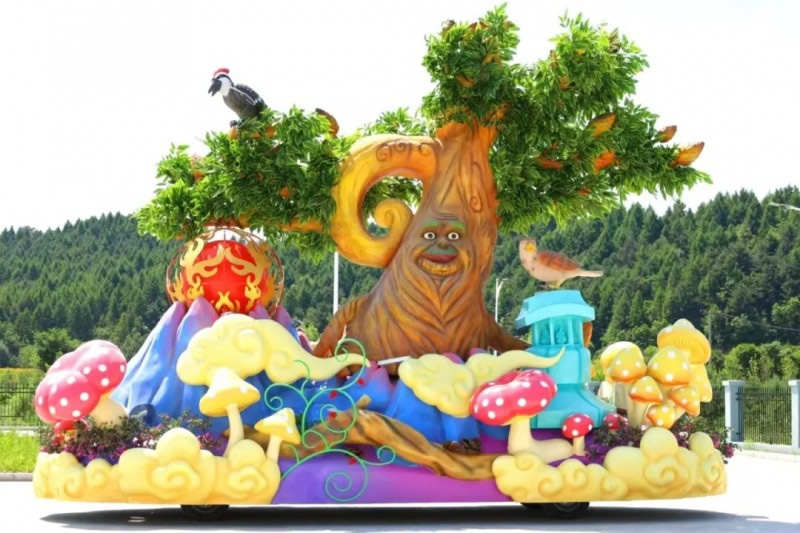 “林間秘境”花車,巧妙融合了小興安嶺原始森林的獨(dú)特魅力。潔白的白樺林與蒼翠的紅松林交相輝映,展現(xiàn)伊春作為“紅松故鄉(xiāng)”的生態(tài)底蘊(yùn)。靈動(dòng)的松鼠、威武的東北虎、呆萌的狍子和憨厚的黑熊,共同演繹著森林王國(guó)的和諧樂(lè)章;ㄜ囃ㄟ^(guò)生動(dòng)的動(dòng)植物造型,不僅呈現(xiàn)了伊春豐富的生物多樣性,更傳遞出“綠水青山就是金山銀山”的生態(tài)理念,彰顯這座森林之城在生態(tài)文明建設(shè)中的示范意義,喚起人們對(duì)自然保護(hù)的深切關(guān)注。
