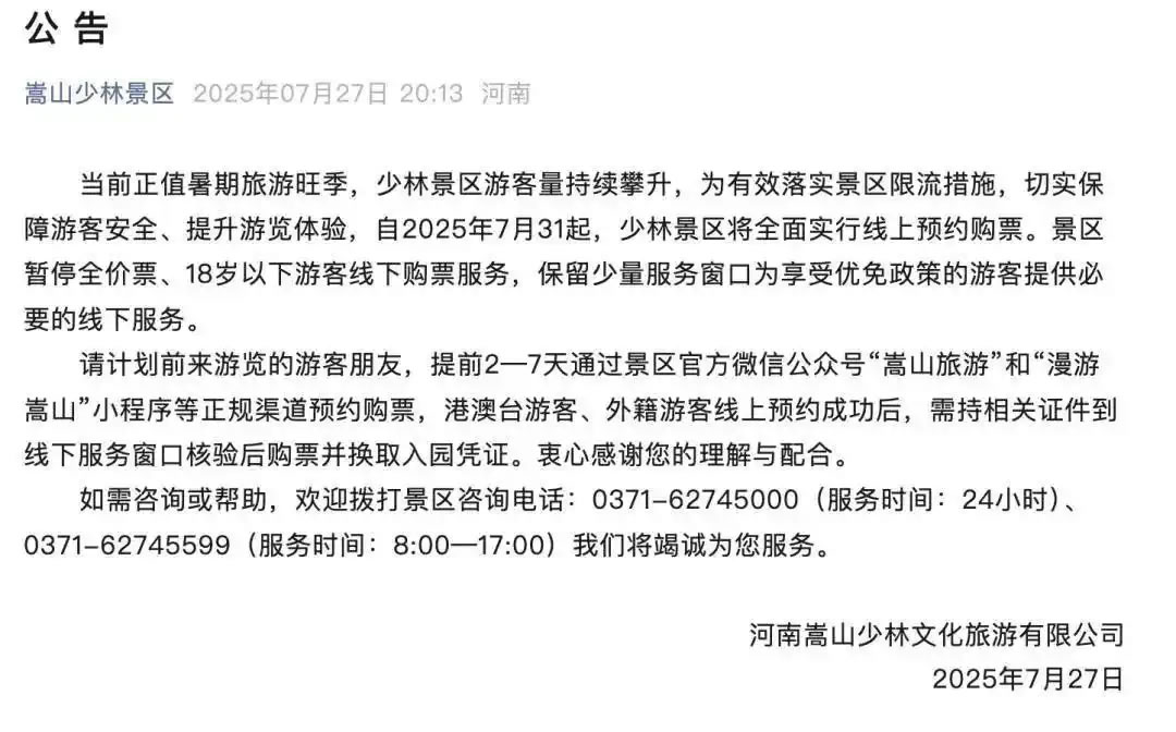7月27日,嵩山少林景區(qū)官方公眾號發(fā)布最新消息顯示:當(dāng)前正值暑期旅游旺季,少林景區(qū)游客量持續(xù)攀升,為有效落實景區(qū)限流措施,切實保障游客安全、提升游覽體驗,自2025年7月31日起,少林景區(qū)將全面實行線上預(yù)約購票。景區(qū)暫停全價票、18歲以下游客線下購票服務(wù),保留少量服務(wù)窗口為享受優(yōu)免政策的游客提供必要的線下服務(wù)。