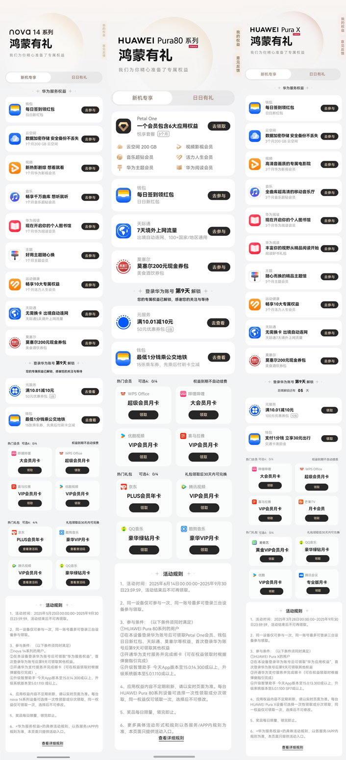 暑期,華為“負(fù)一屏”還上線了“鴻蒙有禮”權(quán)益禮包,覆蓋影視娛樂(lè)、旅行交通、外賣餐飲等多重場(chǎng)景,為用戶帶來(lái)更便捷、更優(yōu)惠、更智慧的暑期生活服務(wù)。購(gòu)買Pura X、nova 14系列及Pura 80的新用戶還有額外的“新機(jī)專享”禮包。喚醒小藝說(shuō):“幫我領(lǐng)鴻蒙有禮”也能跳轉(zhuǎn)領(lǐng)取。