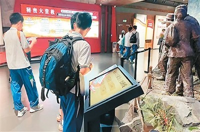 游客步入館內,仿佛踏入歷史的洪流。全息投影、文物陳列、場景復原等技術打造出數(shù)字化展陳空間。曾經(jīng)只能在文字和圖片中描繪的歷史場景,如今栩栩如生地呈現(xiàn)在眼前。在秘密大營救展區(qū),雕塑還原文化名人在游擊隊員護送下離開的場景,當觀眾點擊多媒體互動裝置選擇不同的撤退路線時,大屏幕會動態(tài)還原當時驚險的轉移路徑,讓人如同身在其中,真切感受到革命先輩在槍林彈雨中的英勇機智。來自廣州的黃同學說:“有了這些多媒體設備,讓我更直觀了解到當時槍林彈雨的危險場景,也更好地學習了東江縱隊的歷史。”