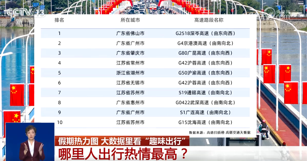 您知道哪里的人出行熱情高嗎?有網(wǎng)友說,聰明人都提前出門了。高德交通大數(shù)據(jù)顯示,10月1日0點至10點,全國十大繁忙出程高速路段中,長三角與粵港澳大灣區(qū)各占一半。其中,廣東的高速、火車站、機場等繁忙程度全面領(lǐng)跑全國。同時段全國十大繁忙高速服務(wù)區(qū)中,廣東占8席,江蘇占2席,廣東人的長假出門熱情領(lǐng)跑全國。