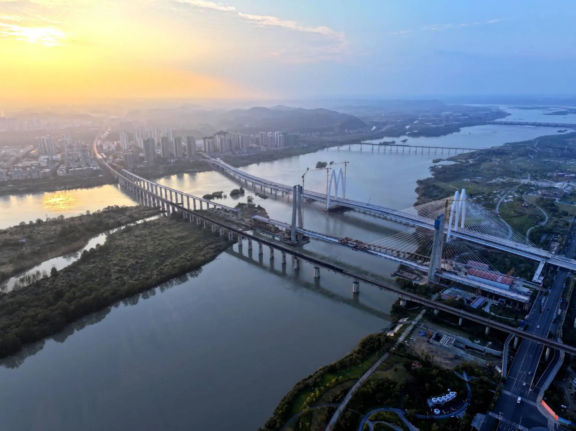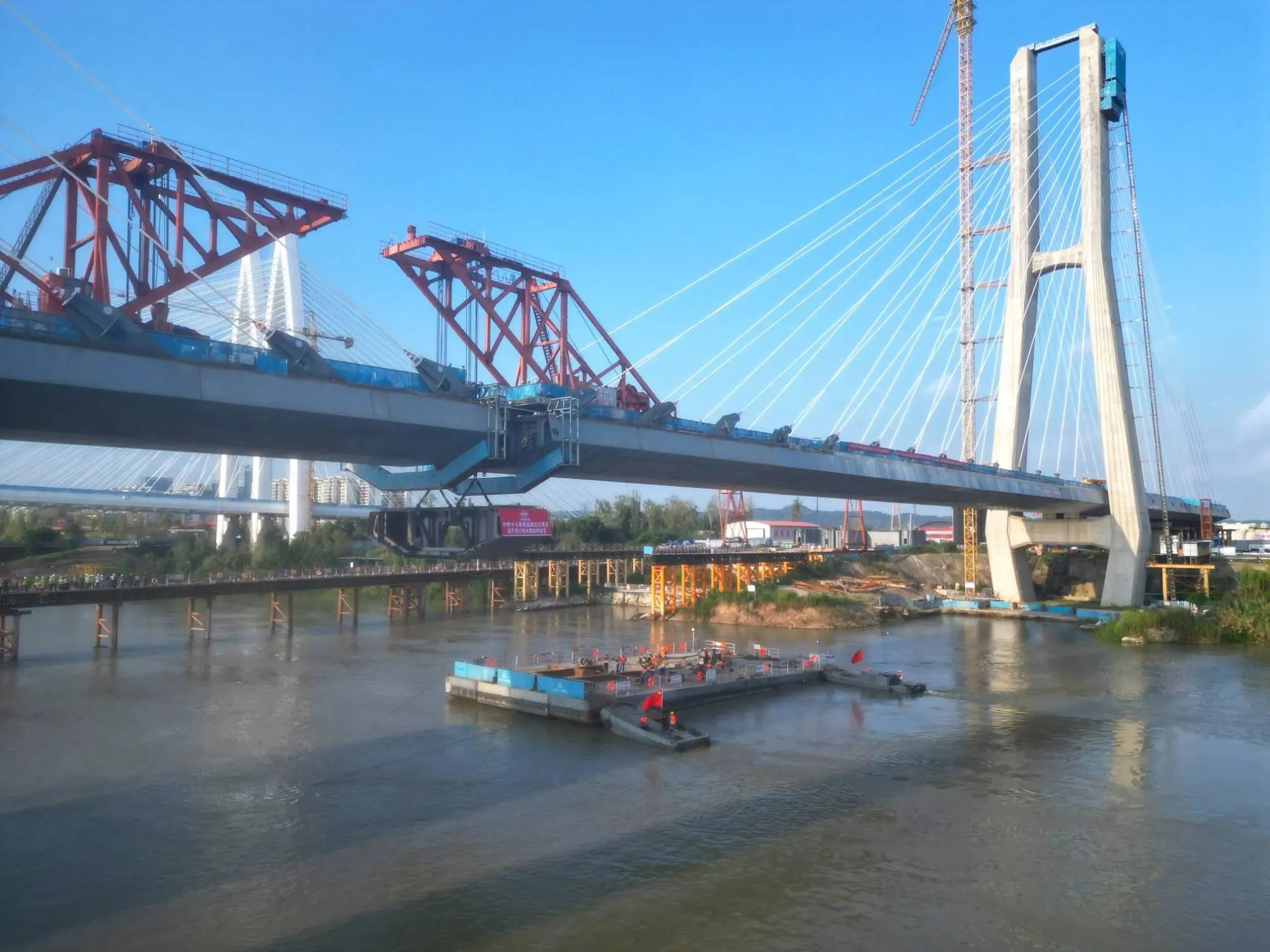 據(jù)中鐵十七局成達(dá)萬(wàn)高鐵項(xiàng)目二工區(qū)總工程師單立國(guó)介紹,由于大橋橫跨涪江,施工團(tuán)隊(duì)創(chuàng)新采用“浮運(yùn)+橋面吊裝”方案,先將鋼箱梁通過浮箱從碼頭運(yùn)輸至江心指定位置,再運(yùn)用150噸橋面吊機(jī)進(jìn)行精準(zhǔn)提升。為確保合龍精準(zhǔn)可控,項(xiàng)目團(tuán)隊(duì)提前謀劃、周密部署。針對(duì)大跨度斜拉橋合龍段受力復(fù)雜、溫度變形敏感、精度控制要求高等技術(shù)難點(diǎn),團(tuán)隊(duì)選擇夜間“溫度低、溫差小”時(shí)段進(jìn)行合龍,有效減少溫度變化引起的結(jié)構(gòu)變形,并通過線形監(jiān)控、勁性鎖定等關(guān)鍵技術(shù)措施,最終將線形精度控制在毫米級(jí)范圍,實(shí)現(xiàn)高質(zhì)量合龍。