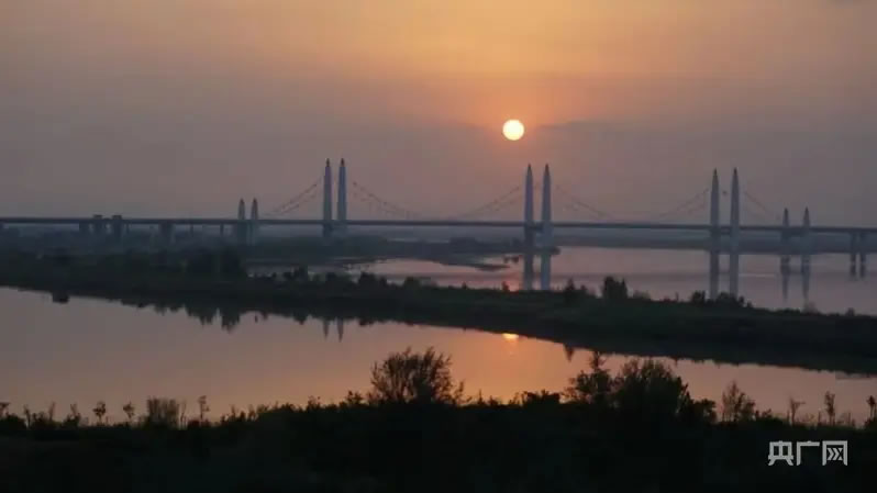 黃河濕地公園畔,落日與長橋在水面繪就絕美畫卷(央廣網(wǎng)發(fā) 楊佳 攝)