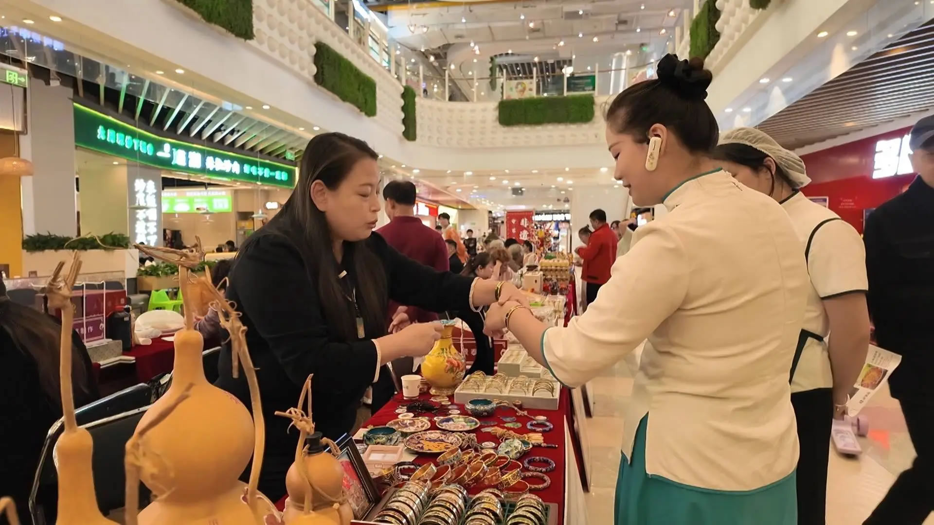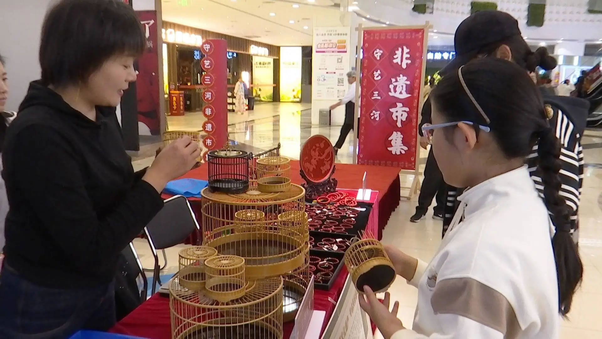 在三河喬鳥籠的攤位前,非遺傳承人正耐心地為一位小朋友講解鳥籠的制作奧秘,從選料到打磨,再到微小部件的精密組裝,精湛的技藝讓充滿好奇的孩子驚嘆不已。與此同時(shí),在商場(chǎng)一樓的“守藝三河”非遺精品展示區(qū),包括鼻煙壺、三河喬鳥籠在內(nèi)的多項(xiàng)非遺產(chǎn)品,吸引著往來(lái)顧客的目光。