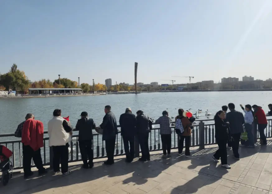 10月28日,在杜鵑河彭加木雕像水域附近,成群的天鵝和野鴨等鳥類在河面上游弋、嬉戲,潔白的天鵝與碧水、藍(lán)天、樓宇相映成趣,美輪美奐,吸引了不少市民和游客駐足欣賞,構(gòu)成一幅自然和諧的生動畫卷。重慶游客張清揚說:“第一次來到庫爾勒,看到美麗的天鵝,心情都被治愈了,這是大自然的饋贈,庫爾勒的自然環(huán)境好,才會吸引這么多天鵝來這里過冬。”
