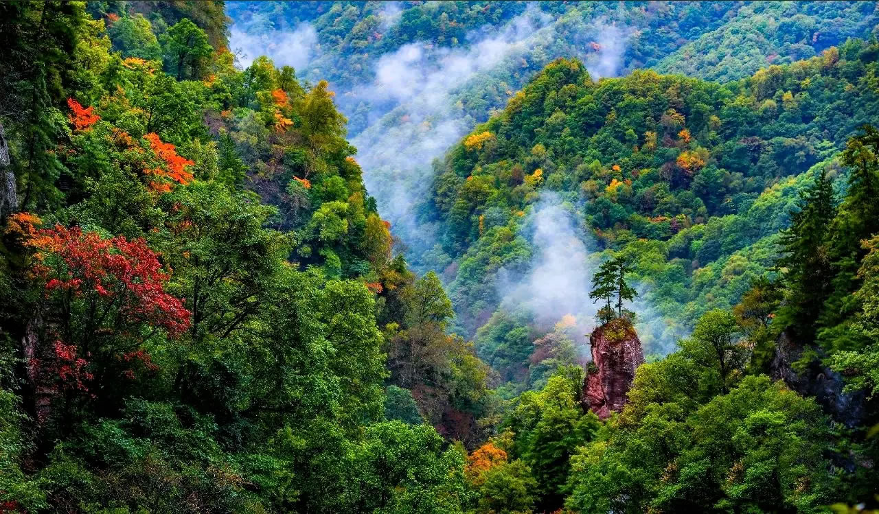 山河入秋,大地鎏金。走進國家級風景名勝區(qū)甘肅華亭關山蓮花臺,仿佛走進了五顏六色的童話世界——層林盡染,五彩繽紛,秋意在這里揮灑得淋漓盡致?諝庵懈又嗤恋臏貪櫯c草木的清香,山間那些不知名的野花依然開得爛漫,如散落的星辰點綴林間。