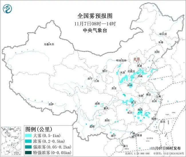 中央氣象臺(tái)今天(11月7日)06時(shí)繼續(xù)發(fā)布大霧黃色預(yù)警:預(yù)計(jì),7日早晨至上午,河北南部、河南中北部、山東北部和東部、山西南部、湖北南部、江西中部、福建西北部等地的部分地區(qū)有大霧,其中,山東東部、江西中西部、福建西北部等地的部分地區(qū)有能見(jiàn)度不足500米的濃霧,局地有能見(jiàn)度不足200米的強(qiáng)濃霧。