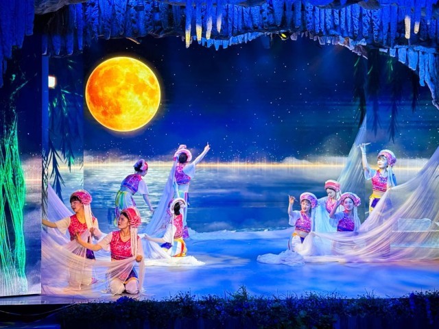島上的龍宮溶洞是一處天然形成的水下溶洞,全長(zhǎng)約1300米,可以說是全國(guó)僅存在水島上的溶洞。洞內(nèi)石柱、石筍、石幔等喀斯特地貌景觀發(fā)育完整。特別值得一提的是,洞內(nèi)設(shè)有水下劇場(chǎng),每天上演反映白族漁家生活的歌舞表演,成為游客了解當(dāng)?shù)匚幕闹匾翱凇?/p>