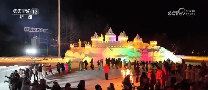夜幕下的漠河市北極村被燈光點亮,惟妙惟肖的雪雕有了不一樣的顏色。在小廣場上,天南地北的游客聚在一起攜手起舞,并用鏡頭記錄下浪漫的煙火。為滿足滑雪愛好者的需求,當(dāng)?shù)匮﹫鼋衲晔状伍_放夜滑,并新增了雪道。