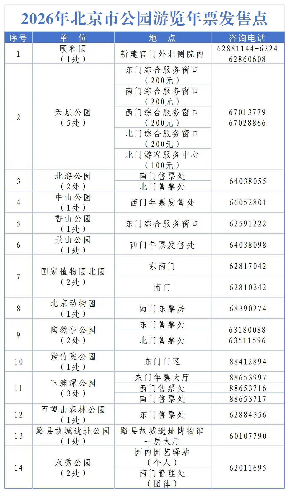 北京市公園游覽年票(100元)適用頤和園、天壇公園、北海公園、中山公園、香山公園、景山公園、國家植物園北園、北京動(dòng)物園、陶然亭公園、玉淵潭公園、百望山森林公園、雙秀公園、北京國際雕塑公園、大觀園、地壇公園、水立方。使用時(shí)限為2026年1月1日到2027年1月31日。