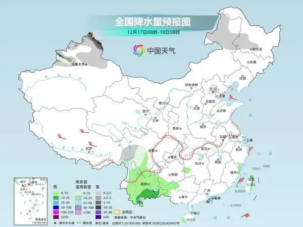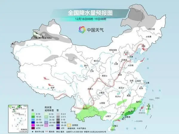 后天,內(nèi)蒙古東北部、黑龍江中北部、新疆北部和南疆西部山區(qū)、甘肅河西等地部分地區(qū)有小到中雪或雨夾雪,其中,新疆沿天山地區(qū)和伊犁河谷局地有大到暴雪。湖南南部、福建東部和南部、西南地區(qū)南部、廣西西南部、廣東東部和南部、海南島東部、臺(tái)灣島東部等地部分地區(qū)有小到中雨,其中,廣東東部局地有大雨。
