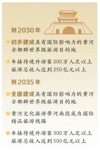 《規(guī)劃》設(shè)定的雙階段目標(biāo),為黃河古都群的發(fā)展錨定了清晰航向。到2030年,初步建成具有國際影響力的黃河古都群世界級旅游目的地,年接待境外游客200萬人次以上,旅游總收入達(dá)到250億元以上;到2035年,全面建成具有國際影響力的黃河古都群世界級旅游目的地,黃河文化旅游帶河南段成為國際精品旅游線路,年接待境外游客300萬人次以上,旅游總收入達(dá)到500億元以上。