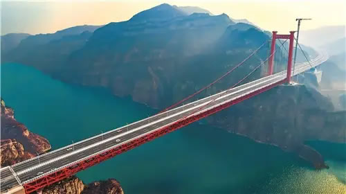 蜿蜒如龍的濟新高速,長度約48公里,點睛之筆就是這座黃河三峽大橋。長1688.5米、主跨度555米,這座“咽喉工程”不僅是我省跨徑最大的橋梁,也在世界工程史上留下河南地標。