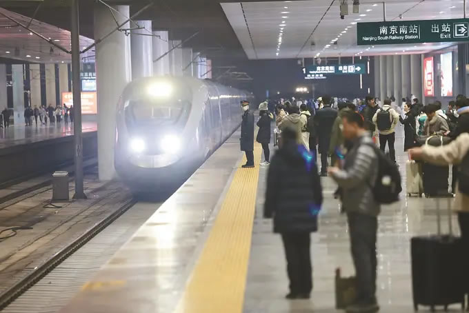 從1月26日零時起,全國鐵路實行新的列車運行圖,調圖后,圖定旅客列車較原圖增加243列。京滬高鐵標桿列車G25次迎來了“瘦身”升級:這趟京滬間最快高鐵取消原有5個?空,僅設南京南站唯一經停點。圖為當日晚,旅客在南京南站準備乘坐G25次列車。(陳儼 攝)