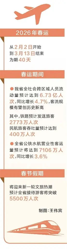 2026年春運(yùn)從2月2日開始,到3月13日結(jié)束,為期40天。今年春節(jié)是個(gè)“大年”,共有9天假期,預(yù)計(jì)群眾返鄉(xiāng)、探親、旅游的出行意愿將更加強(qiáng)烈。春運(yùn)期間,預(yù)計(jì)我省全社會(huì)跨區(qū)域人員流動(dòng)量達(dá)到6.73億人次,同比增長4.7%,客流規(guī)模有望創(chuàng)歷史新高,其中鐵路預(yù)計(jì)發(fā)送旅客2773萬人次,民航旅客吞吐量預(yù)計(jì)達(dá)到400萬人次。