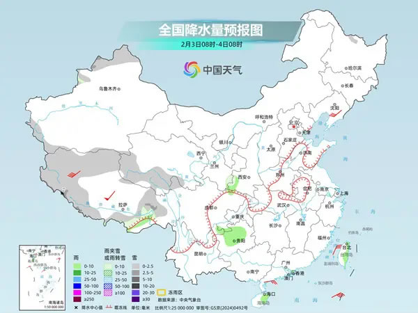 明天,新疆北疆大部和南疆東南部、青海中部和東南部、西藏東部和南部、川西高原北部、內(nèi)蒙古東部、遼寧東北部、吉林大部、黑龍江中南部等地部分地區(qū)有小到中雪或雨夾雪,其中,新疆北疆東部和伊犁河谷、西藏東部、青海南部等地局地有大雪或暴雪;西藏東南部、四川東南部、重慶南部、湖北南部、貴州中東部、湖南西部、廣西中東部、海南島東部、臺(tái)灣島東部等地部分地區(qū)有小到中雨。