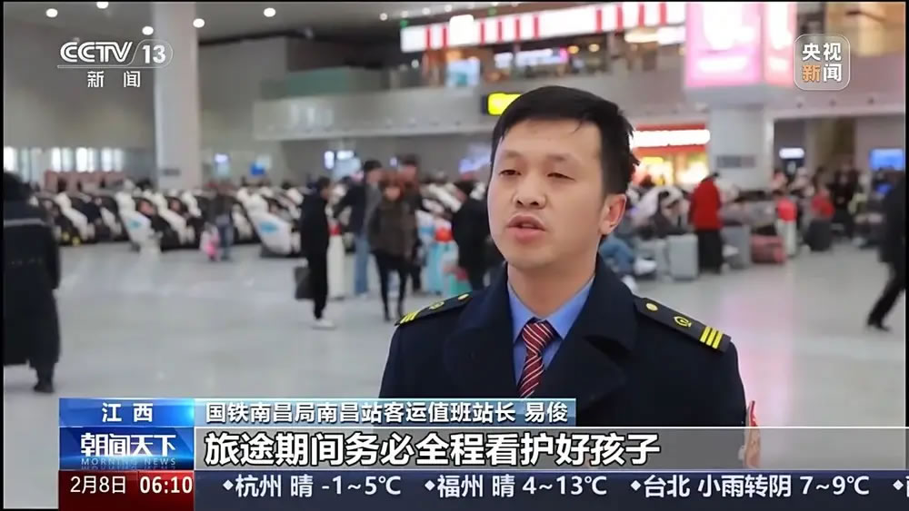 國(guó)鐵南昌局南昌站客運(yùn)值班站長(zhǎng) 易俊:旅途期間務(wù)必全程看護(hù)好孩子,切勿讓孩子脫離視線。如需幫助,可聯(lián)系車(chē)站工作人員和民警,謹(jǐn)防孩子走失、接觸陌生人員。