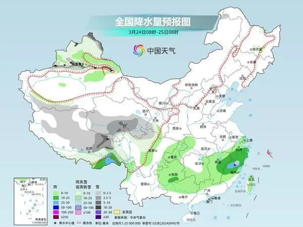 后天,新疆東部、西藏東部、甘肅河西地區(qū)、青海北部等地部分地區(qū)有小到中雪或雨夾雪,其中,青海北部、甘肅河西等地局地大到暴雪。江南中東部等地部分地區(qū)有中到大雨,其中,福建西北部等地部分地區(qū)有暴雨。
