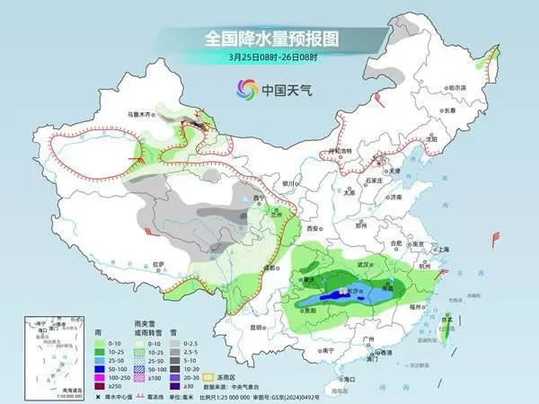 明天,新疆東部、西藏東部、青海中南部和東部、川西高原等地部分地區(qū)有小雪或雨夾雪,其中,新疆東部、西藏東北部、青海東部等地部分地區(qū)有中到大雪,新疆東部等地局地暴雪。湖南中北部、江西中北部、重慶東南部、貴州東北部等地部分地區(qū)有中到大雨,其中,湖南中西部、貴州東北部等地部分地區(qū)有暴雨。