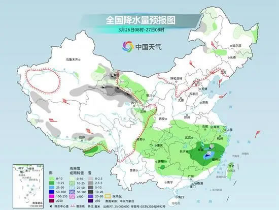 未來三天,南方仍有較大范圍陰雨天氣,西南地區(qū)東部、江南、華南北部等地有中到大雨,貴州中南部、湖南中部、江西中部、福建北部等地局地有暴雨,上述地區(qū)局地伴有短時強(qiáng)降水或風(fēng)雹天氣。此外,青藏高原東部多雨雪天氣,新疆沿天山高海拔山區(qū)有中到大雪,局地有暴雪或大暴雪。