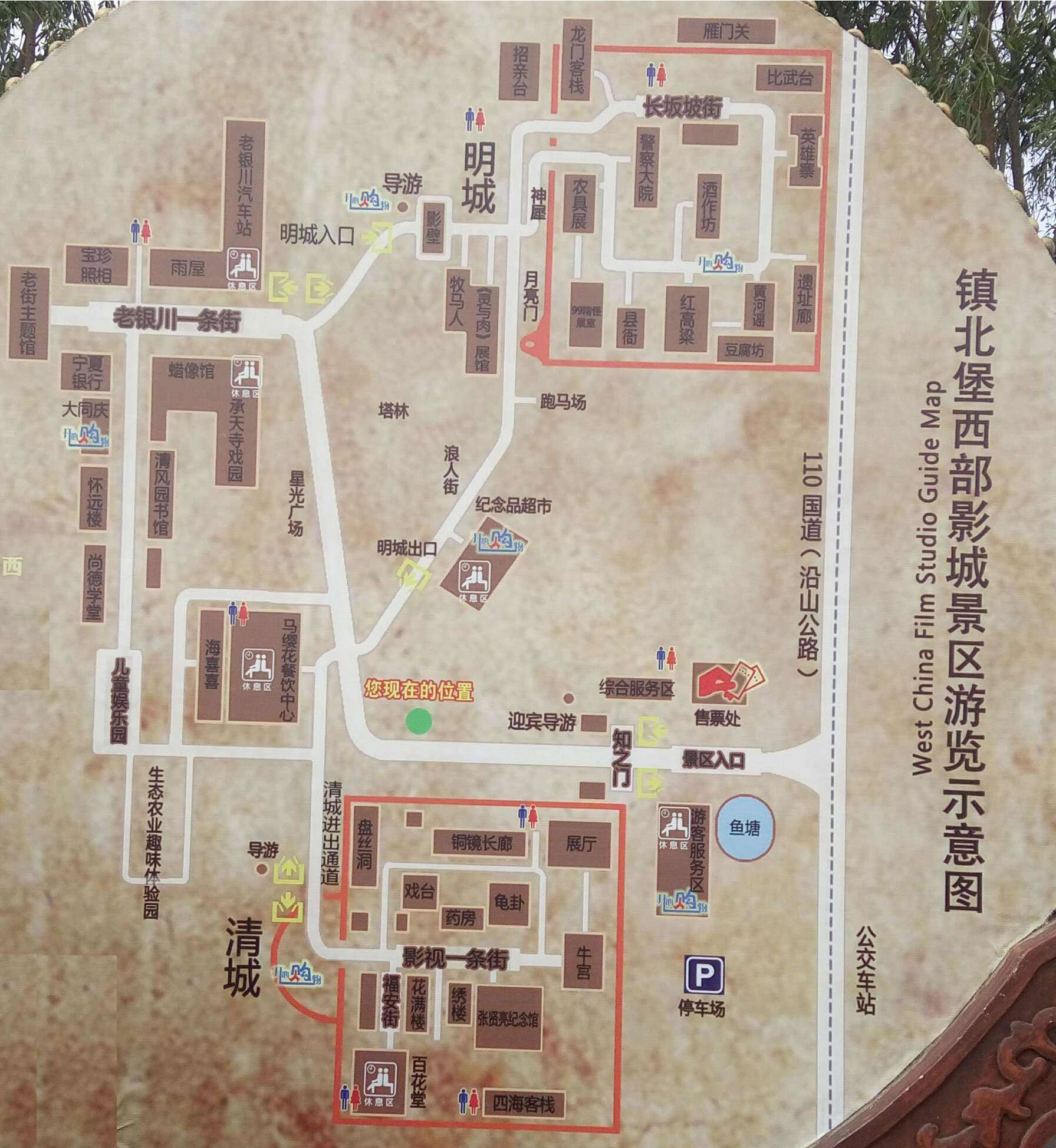 明城,位于鎮(zhèn)北堡西部影城西南端(清城南側(cè)),建于明弘治年間(公元1500年),是明代沿長(zhǎng)城西北線所建的眾多軍事要塞之一,取名“鎮(zhèn)北堡”。清乾隆三年(公元1738年),鎮(zhèn)北堡兵營(yíng)毀于地震。明城體現(xiàn)原始、粗獷、古樸、荒涼的自然面貌,是影視城的主拍攝場(chǎng)景,主要景點(diǎn)有聚寶盆、牧馬人、文革大院、月亮門、關(guān)中城門、柴草店、盤絲洞、定州總管府、酒作坊、九兒居室、鐵匠營(yíng)、遺址廊、招親臺(tái)、龍門客棧等。明代所建鎮(zhèn)北堡震塌后,清政府重修兵營(yíng)。鎮(zhèn)北堡一地有兩府兵營(yíng),為中國(guó)獨(dú)有的現(xiàn)象,形成一個(gè)“太極圖”。