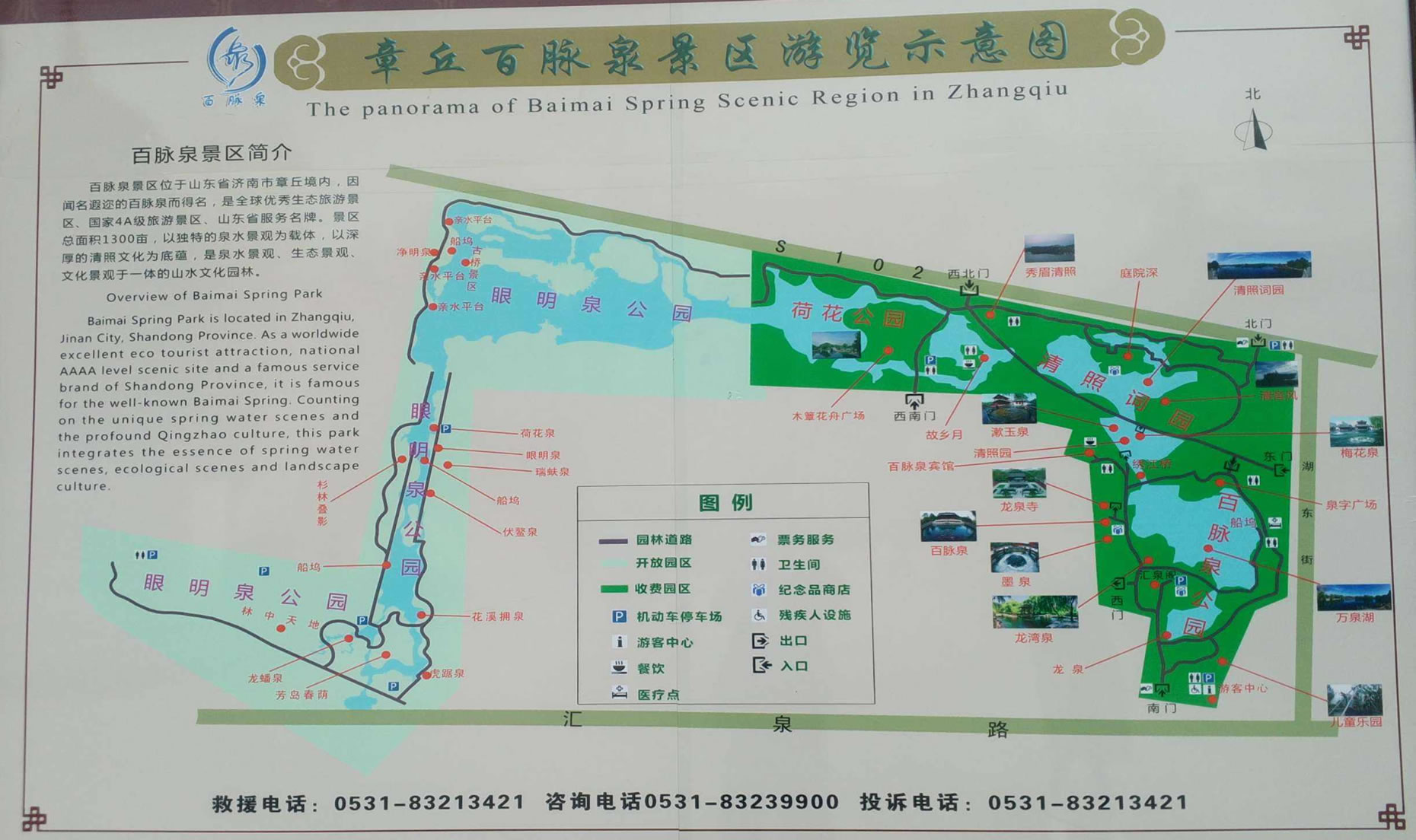 公園布局由著名園林專(zhuān)家孫筱祥先生設(shè)計(jì),園名由已故著名書(shū)法大師舒同題寫(xiě)。園內(nèi)噴泉5處,石拱橋3座,石土假山2座,石、木板平橋、各一架。并建有匯泉閣、湖心亭、船塢碼頭等。公園景點(diǎn)布局因地緣勢(shì),順?biāo)飨,逐次展開(kāi),設(shè)計(jì)獨(dú)特,構(gòu)思巧妙。全園分為泉水、花園、幽靜學(xué)習(xí)、林蔭散步、兒童樂(lè)園5個(gè)區(qū)。泉水區(qū):奇花異草,千姿百態(tài)、鳥(niǎo)語(yǔ)花香,競(jìng)相斗艷。幽靜學(xué)習(xí)區(qū):環(huán)境幽雅,空氣清新,掩卷吟歌,浮想聯(lián)翩。密林散步區(qū):小橋流水,蜿蜒曲折,灌木叢生,暗柳成蔭。兒童樂(lè)園區(qū):游龍戲水,木馬滑梯,蕩秋千,跳蹦蹦床,高架橋,星空穿梭游藝機(jī),樂(lè)不思?xì)w。公園內(nèi)樓、臺(tái)、亭、榭、閣,點(diǎn)綴其間,錯(cuò)落有致,相互輝映。假山、密林、湖水、斷橋,別有洞天,可謂“疑是山窮水無(wú)路,柳暗花明又一景”。濟(jì)南七十二名泉中的百脈泉乃園中勝景,公園也因之得名。1997年5月,又在園西北隅建成清照罷工(李清照紀(jì)念館),公園風(fēng)光無(wú)限,更添春色。百脈泉公園是鑲嵌在章丘大地上的一顆明珠。百脈泉公園,位于山東省濟(jì)南市章丘區(qū)明水境內(nèi),這里是龍山文化的發(fā)祥地,一代詞宗李清照的故里。