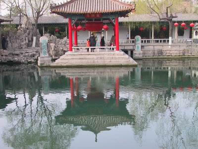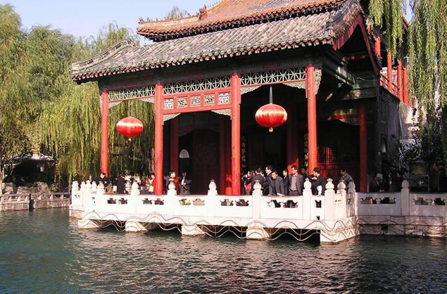 有一組較大的古建筑群在趵突泉北岸,通稱(chēng)三大殿。最南“濼源堂”,三間兩層,歇山飛檐,建于北宋年間,挹廈柱上,刻有元代文學(xué)家、書(shū)法家趙孟兆的著名詩(shī)句:“云霧潤(rùn)蒸華不住,波濤聲震大明湖!弊煮w雄渾有力,詩(shī)句傳神,與波光水影交相輝映更為之添彩。殿后面又有兩殿,原為“娥姜祠”,現(xiàn)改寫(xiě)為“娥英祠”,世人為贊頌舜的兩位妃子娥皇、女英而建祠,以志紀(jì)念。在三大殿院內(nèi)的花格透墻上,鑲嵌著30余方石刻,都是歷代名人的詩(shī)篇。特別珍貴而又不同凡響的是院內(nèi)的那尊的“雙御碑”,記載著康熙三臨、乾隆二臨趵突泉的題詞詩(shī)文,標(biāo)示著趵突泉的非凡地位。