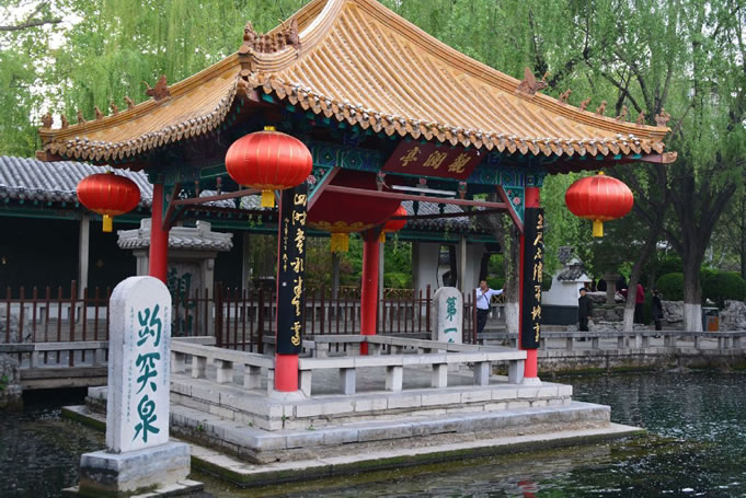趵突泉的南大門(mén)橫匾“趵突泉”藍(lán)底金字,是清朝乾隆帝的御筆,有人譽(yù)為中國(guó)園林“第一門(mén)”。