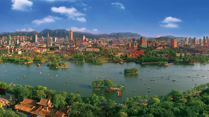 明洪武九年(1376年),濟(jì)南成為山東省會(huì)。民國十八年(1929年)7月,正式設(shè)立濟(jì)南市 。濟(jì)南市是國家歷史文化名城,因地處古四瀆之一“濟(jì)水”(故道為今黃河所據(jù))之南而得名。遠(yuǎn)在9000年前的新石器時(shí)代早期,已有先民在此繁衍生息。距今4000至4500年前以磨光黑陶為特征的“龍山文化”,系因民國十七年(1928年)首次發(fā)現(xiàn)于濟(jì)南東郊龍山鎮(zhèn)而被命名。濟(jì)南是中國人民解放軍北部戰(zhàn)區(qū)陸軍機(jī)關(guān)駐地、環(huán)渤海經(jīng)濟(jì)區(qū)和京滬經(jīng)濟(jì)軸上的重要交匯點(diǎn),華東地區(qū)重要的交通樞紐之一。濟(jì)南因境內(nèi)泉水眾多,擁有“七十二名泉”,素有“天下第一泉”和“四面荷花三面柳,一城山色半城湖”的美譽(yù),濟(jì)南八景聞名于世,超然樓是明湖新八景之一,是網(wǎng)紅打卡地,是擁有“山、泉、湖、河、城”獨(dú)特風(fēng)貌的旅游城市。