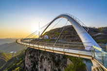 玻璃橋?yàn)闊o(wú)背索斜拉弧形玻璃橋,建于潭溪山海拔700米的崖壁之上,橋面跨度117米,懸空高度101米,外弧最大半徑90米,總承載可達(dá)900噸,單次承載10000人。玻璃橋整體由百米觀光電梯、懸崖酒店及玻璃橋體組成。其中,百米觀光電梯采用全景玻璃設(shè)計(jì),依懸崖而建,集觀光、代步、游覽為一體。橋體的彩虹狀獨(dú)特造型,充滿動(dòng)感與美感,且與山崖風(fēng)格渾然一體。潭溪山高空玻璃橋迄今為止,潭溪山高空玻璃橋已獲得兩項(xiàng)國(guó)際大獎(jiǎng):2019年世界結(jié)構(gòu)大獎(jiǎng)——行人橋梁獎(jiǎng),2020年國(guó)際橋梁大會(huì)(IBC)——亞瑟·海頓獎(jiǎng)。