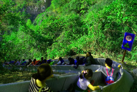滑道自高門洞起,至空中玻璃漂流入口處止,長(zhǎng)約千米。此處山坡陡斜,樹木茂密,滑道從樹叢中順山勢(shì)蜿蜒而下,看似蟒行山間草叢中。其中有八個(gè)急彎,落差較大,乘坐滑道飛速?gòu)纳巾敾辽窖@險(xiǎn)刺激,樂趣無(wú)窮。
